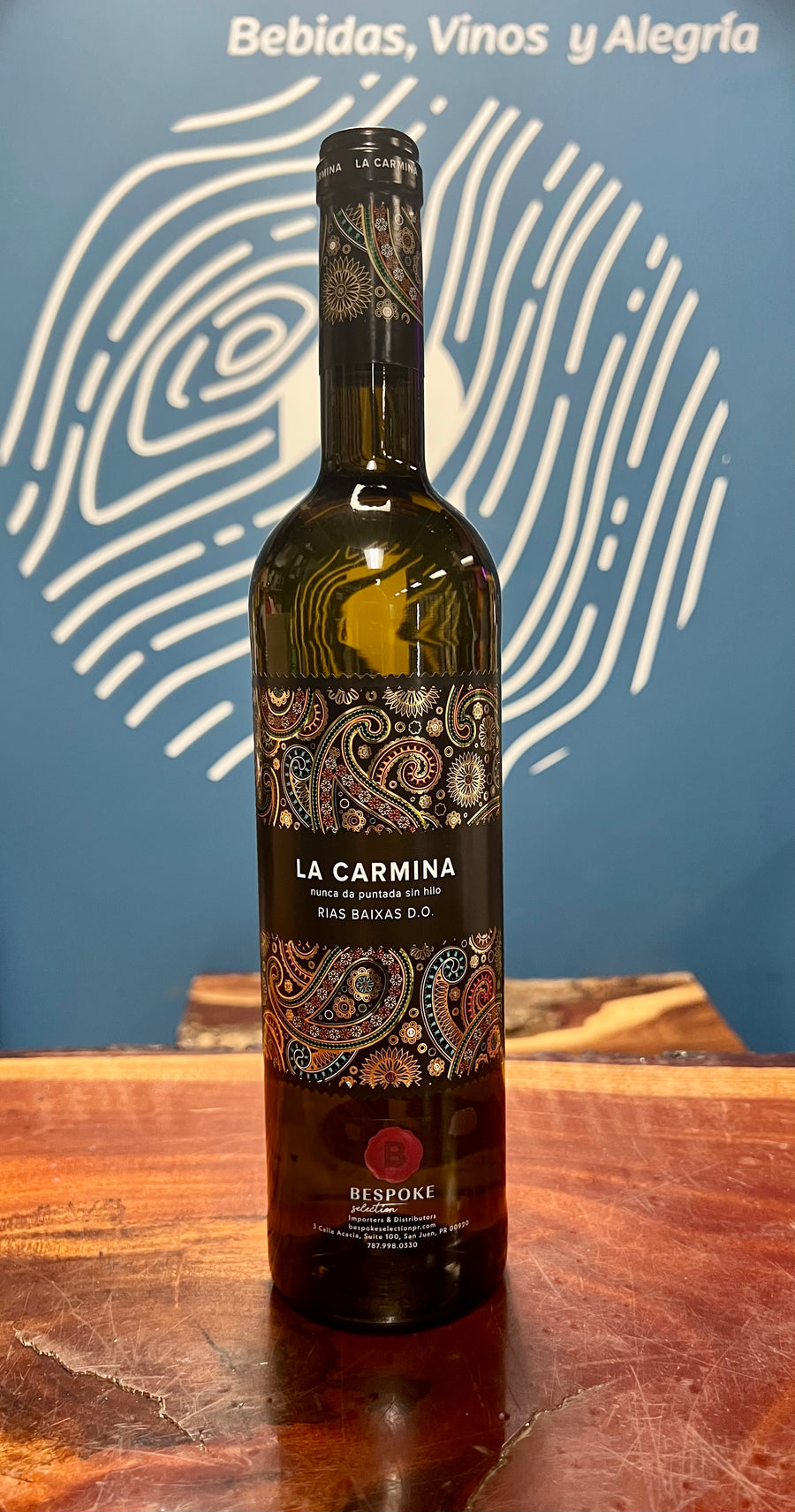 La Carmiña Albariño—fresh Rías Baixas white with citrus, peach, and crisp mineral finish.